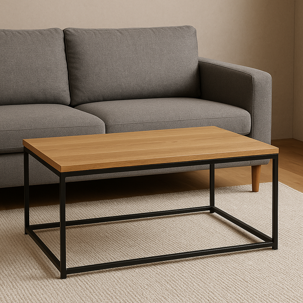 Stilrent soffbord i ljus ekfanér med metallben. Passar perfekt i både moderna och klassiska vardagsrum.